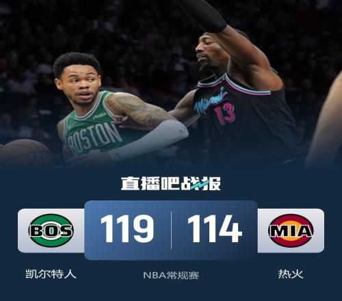 比赛开始,凯尔特人开局慢热半节仅得4分,热火多点开花轰出15-0攻击波一举建立领先,A·西蒙斯接连3记三分追分,首节热火领先11分,次节双方展开拉锯战,凯尔特人依靠替补球员一度追到个位数分差,但希罗连得7分回应,热火半场还是领先10分。下半场,布朗进攻端回暖,连续突破单节15分追分,但热火多点开花始终能回应,热火三节还领先10分,末节绿军8-2咬住比分,随后西蒙斯和豪泽连续三分终于反超比分,双方展开胶着拉锯战,豪泽关键补篮绿军挑战成功,西蒙斯两罚杀死比赛,最终凯尔特人119-114逆转热火。