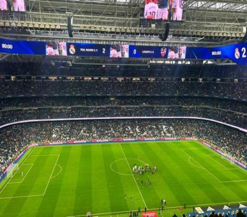 伯纳乌赛前的报送首发和播放队歌等环节期间,可以听到相比于之前的比赛,现场广播明显将声音调高了一个档次,但这依然盖不住现场球迷的漫天嘘声。皇马本场的首发球员被报送出来时,现场嘘声十分明显,其中维尼修斯、贝林厄姆和怀森等人收获了最强烈的嘘声,而作为本队青训的阿森西奥和贡萨洛嘘声则相对要轻了不少,国王杯比赛没有出场的姆巴佩同样也没有收获太多嘘声。本场是阿韦洛亚上任皇马一线队主帅后的伯纳乌首秀,他的名字被报送出来时掺杂着嘘声和掌声,对于这位临危受命的本队名宿,苛刻的皇马球迷还是保持了相对的宽容度。